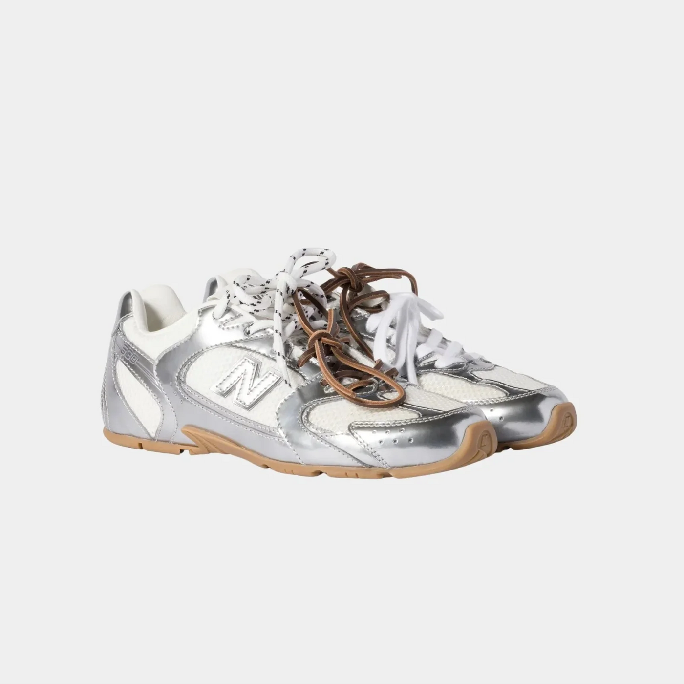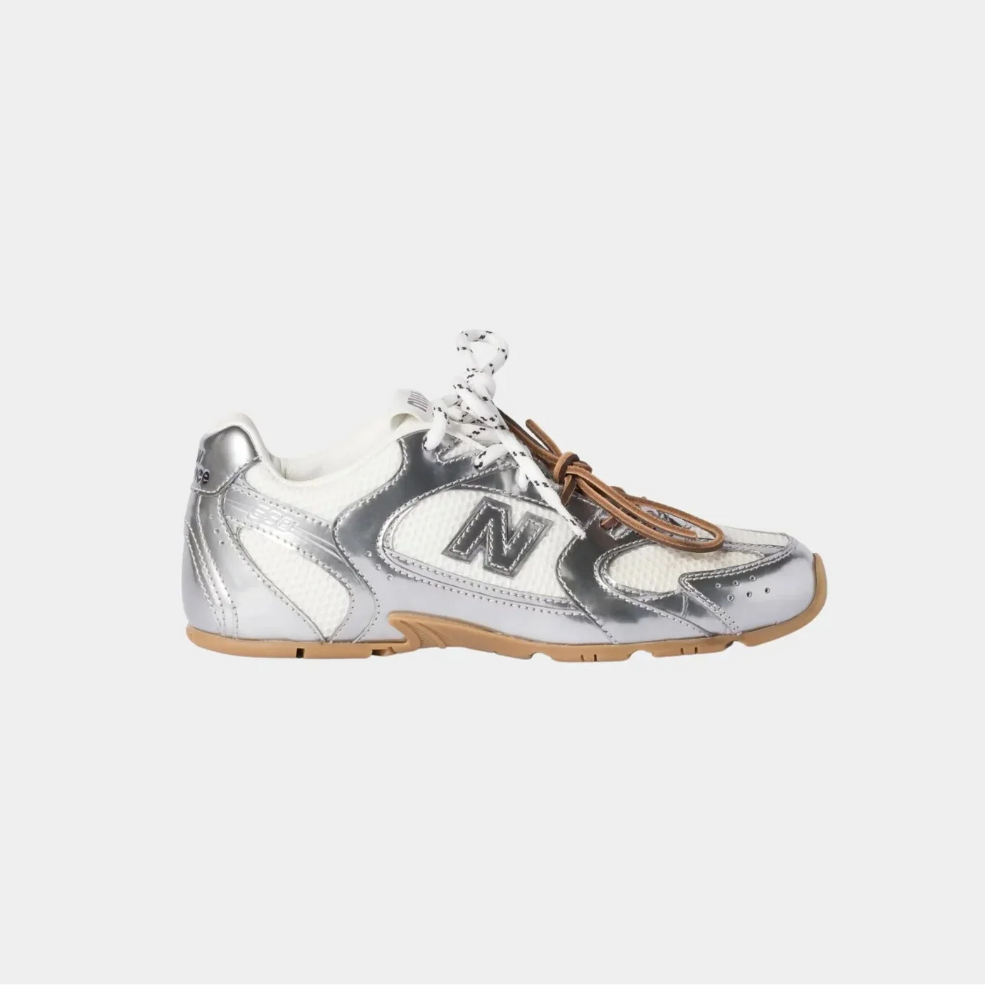 The Miu Miu x New Balance 530 SL is the ultimate expression of the fusion between luxury fashion and contemporary sportswear. This model features an innovative design with a breathable mesh upper combined with silver metallic panels, creating a futuristic and sophisticated look.